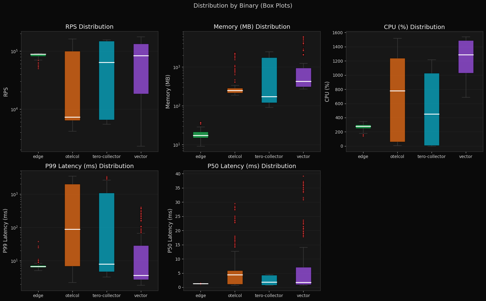 Tero Edge has the tightest distribution across all metrics: RPS around 100K, memory at ~15–20 MB median, P99 latency at ~8 ms with minimal variance. The tero-collector shows higher throughput potential than otelcol but wider variance in CPU and latency. Vector and otelcol both have wide interquartile ranges across runs.