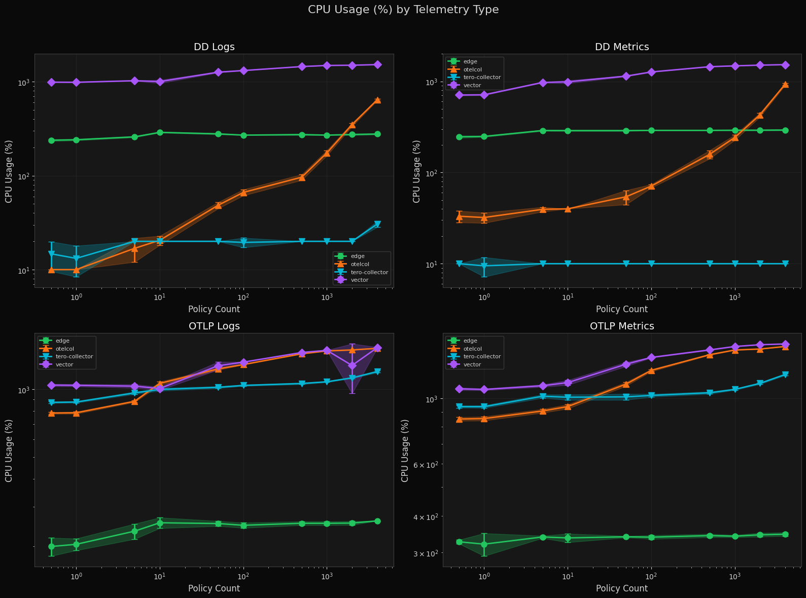 Tero Edge holds flat at ~200–300% CPU for DD Logs and DD Metrics regardless of policy count. Otelcol scales into the thousands of percent at high policy counts. The tero-collector sits at ~10–20% for DD workloads but climbs for OTLP traffic. Vector remains above 1000% across nearly all conditions.