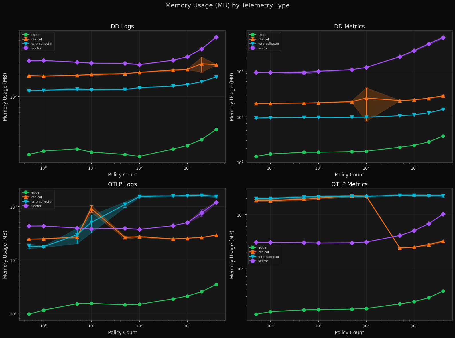 Tero Edge starts in the single-digit MB range and reaches ~50 MB at 2000+ policies. The tero-collector holds at 100–200 MB for DD traffic but rises to ~1–2 GB for OTLP logs at mid-range policy counts before settling. Vector grows unbounded with policy count, while otelcol sits in the middle.