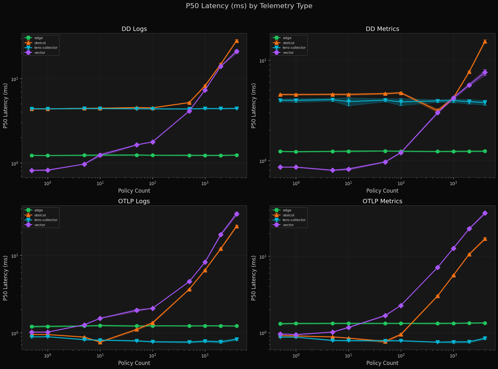 Tero Edge P50 latency sits at 1–2 ms across all telemetry types, flat through 2000 policies. The tero-collector is sub-millisecond on OTLP workloads at low policy counts. Otelcol and Vector both increase sharply beyond 100 policies, with Vector crossing 50 ms P50 on OTLP metrics at high load.