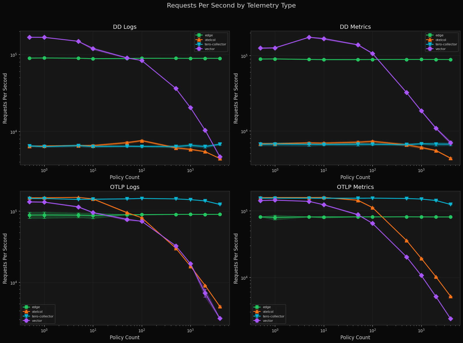 The data shows that policies do scale in constant time. As policy count increases, RPS for Vector and the collector drop exponentially while the tero-collector and tero-edge proxy retain their original RPS. The edge proxy uses far less memory to achieve equivalent performance, and is the most consistent across every category – RPS, memory, and CPU. The modified Tero collector outperforms the unmodified contrib distribution.
